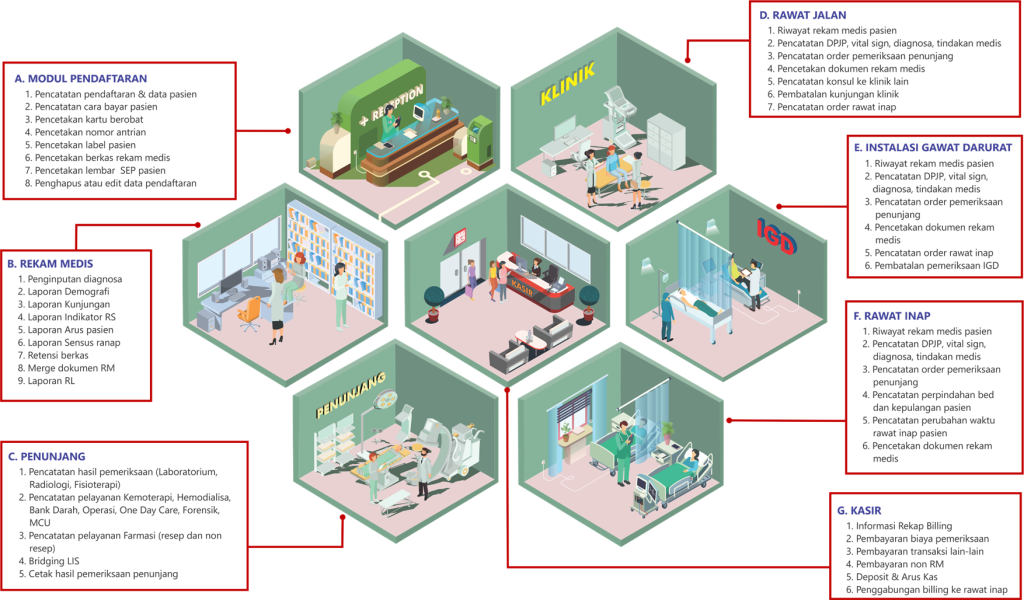 - Terintegrasi dengan aplikasi E-Klaim INACBGs, RS Online, SIRS Online Satu Sehat, SITB, Tanda Tangan Elektronik Tersertifikasi BSRE, dll.